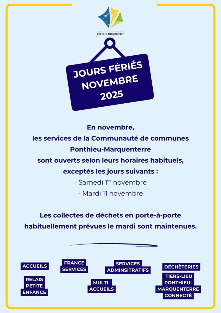 En novembre, les services de la Communauté de communes Ponthieu-Marquenterre sont ouverts selon leurs horaires habituels, exceptés les jours suivants :