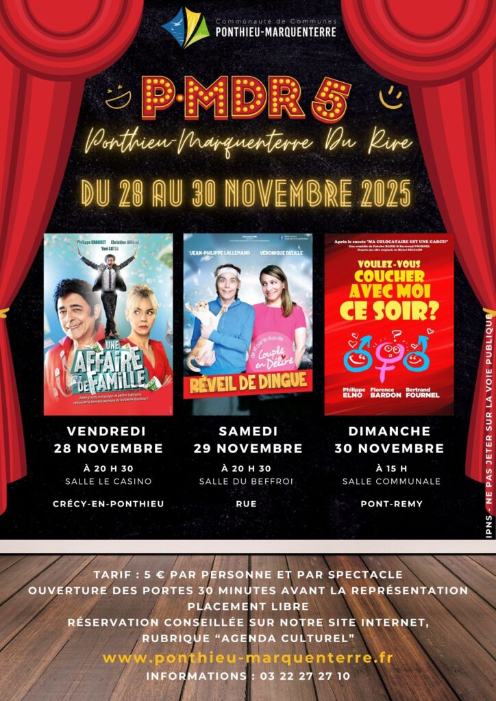 Le festival d’humour de la Communauté de communes revient pour sa 5e édition ! Le Ponthieu-Marquenterre du Rire c’est : trois comédies, trois jours consécutifs, dans trois salles du territoire.