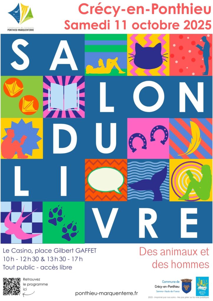 Il se tient ce samedi 11 octobre, à la salle Le Casino à Crécy-en-Ponthieu, et a pour thème « Des animaux et des hommes ». Tout au long de la journée, venez en famille rencontrer les auteurs et acheter leurs livres, découvrir une exposition de peinture, participer au « jeu des quatrièmes de couverture » (et, peut-être, gagner des livres).
