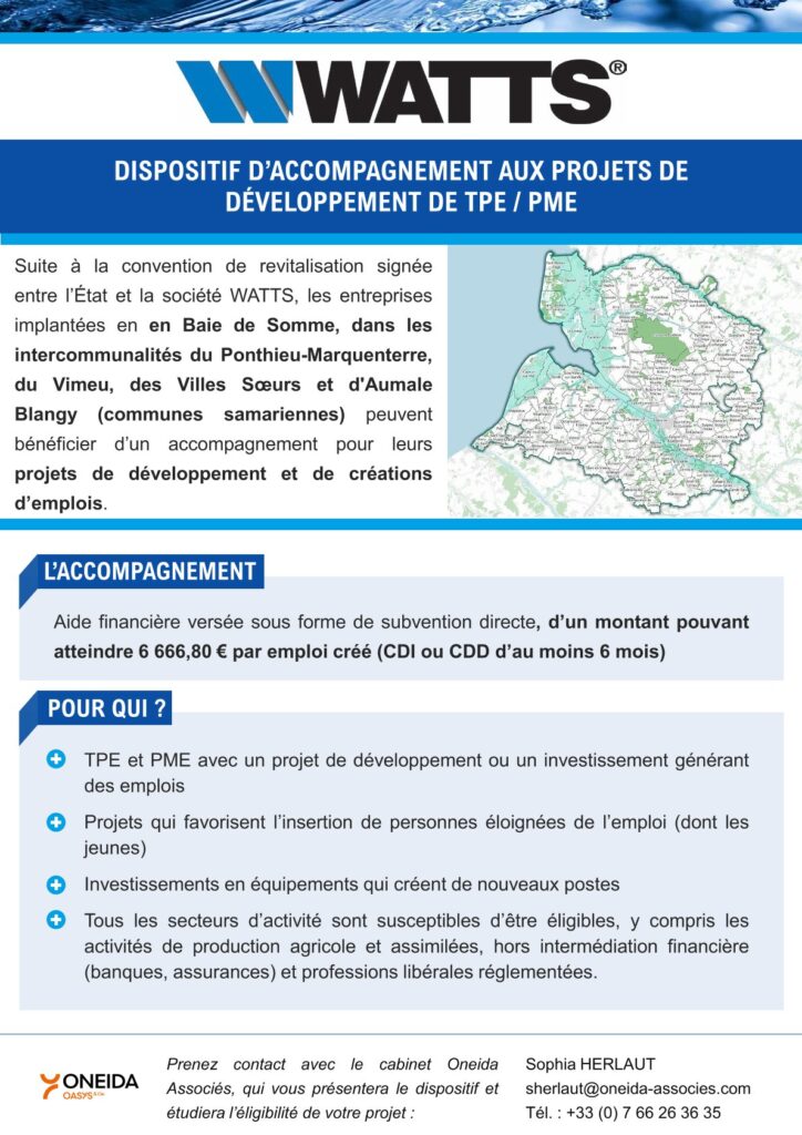 Grâce à la convention de revitalisation signée entre l’État et l’entreprise WATTS, les TPE / PME (Très Petites Entreprises / Petites et Moyennes Entreprises) de moins de 250 salariés et les structures de l’ESS (Économie Sociale et Solidaire) de la Communauté de communes Ponthieu–Marquenterre (CCPM), de la Communauté d’Agglomération de la Baie de Somme (CABS), de la Communauté de communes du Vimeu, de la Communauté de communes des Villes Sœurs et de la Communauté de communes Aumale Blangy peuvent être accompagnées financièrement dans leurs projets de développement et de création d’emplois.